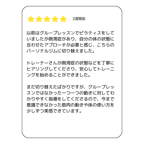 体力の低下もあり器具を使った追い込むような筋トレには多少抵抗があったのですが、細かなカウンセリングと身体評価があり私の身体の状態に合わせたピラティスのエクササイズから始めてくださりとても安心して身を預ける事ができました。